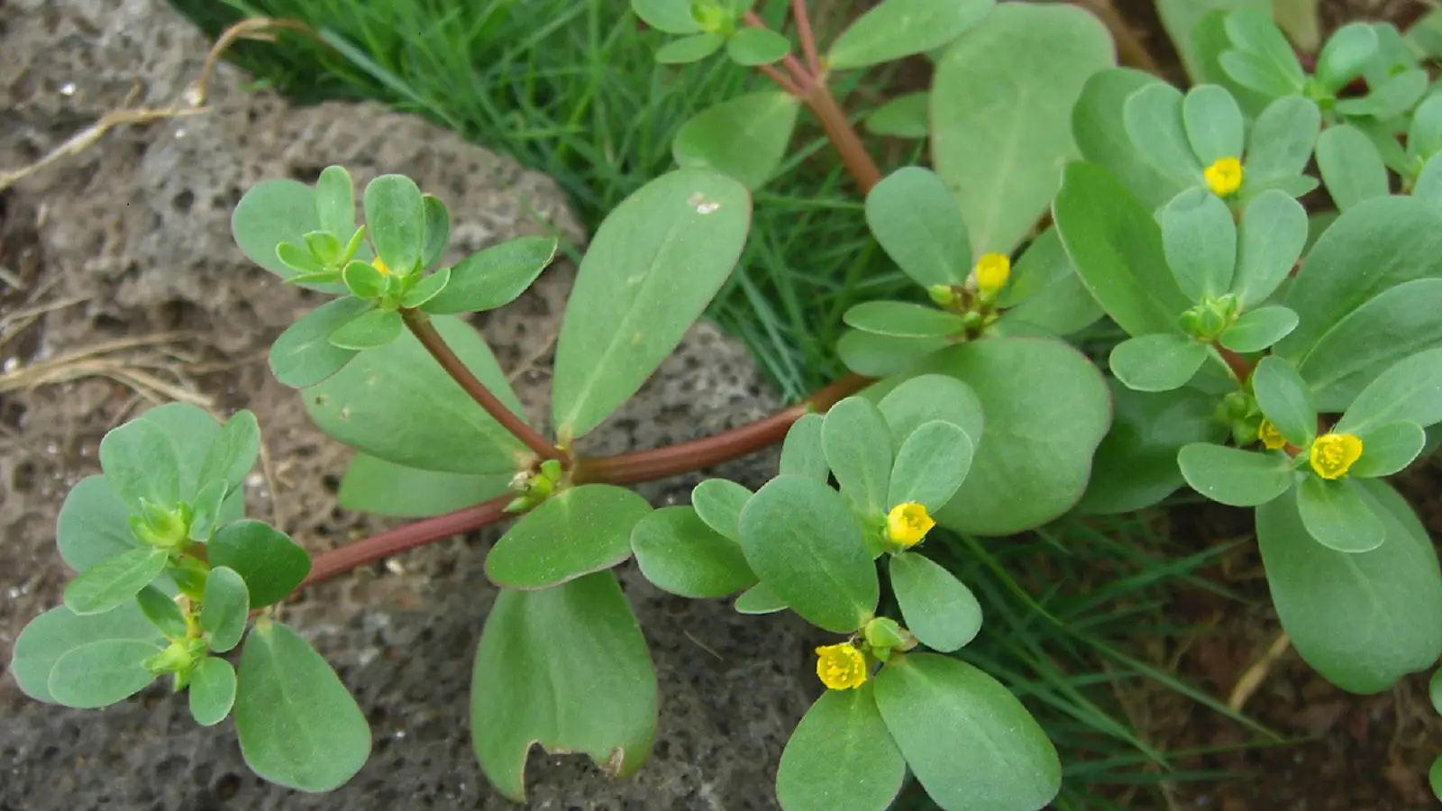 Portulaca oleracea. All of the plant is edible: the thick fleshy stems, the leaves, and the flowers. The stems steam up very nicely, but it is also fine chopped finely into a salad.