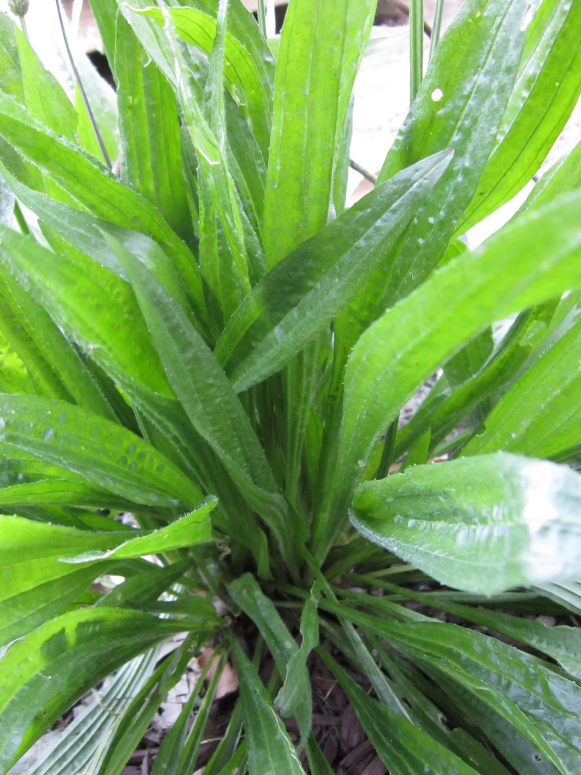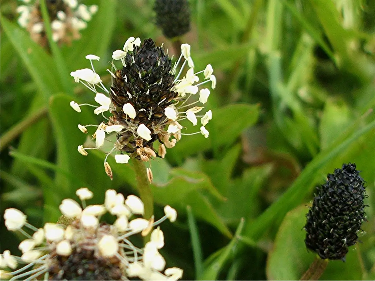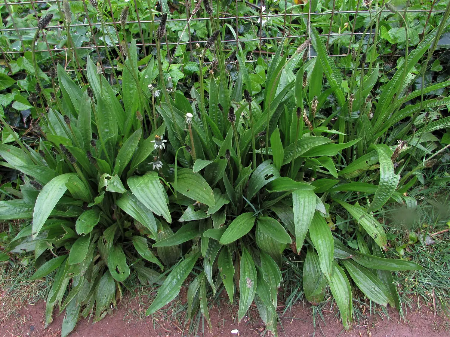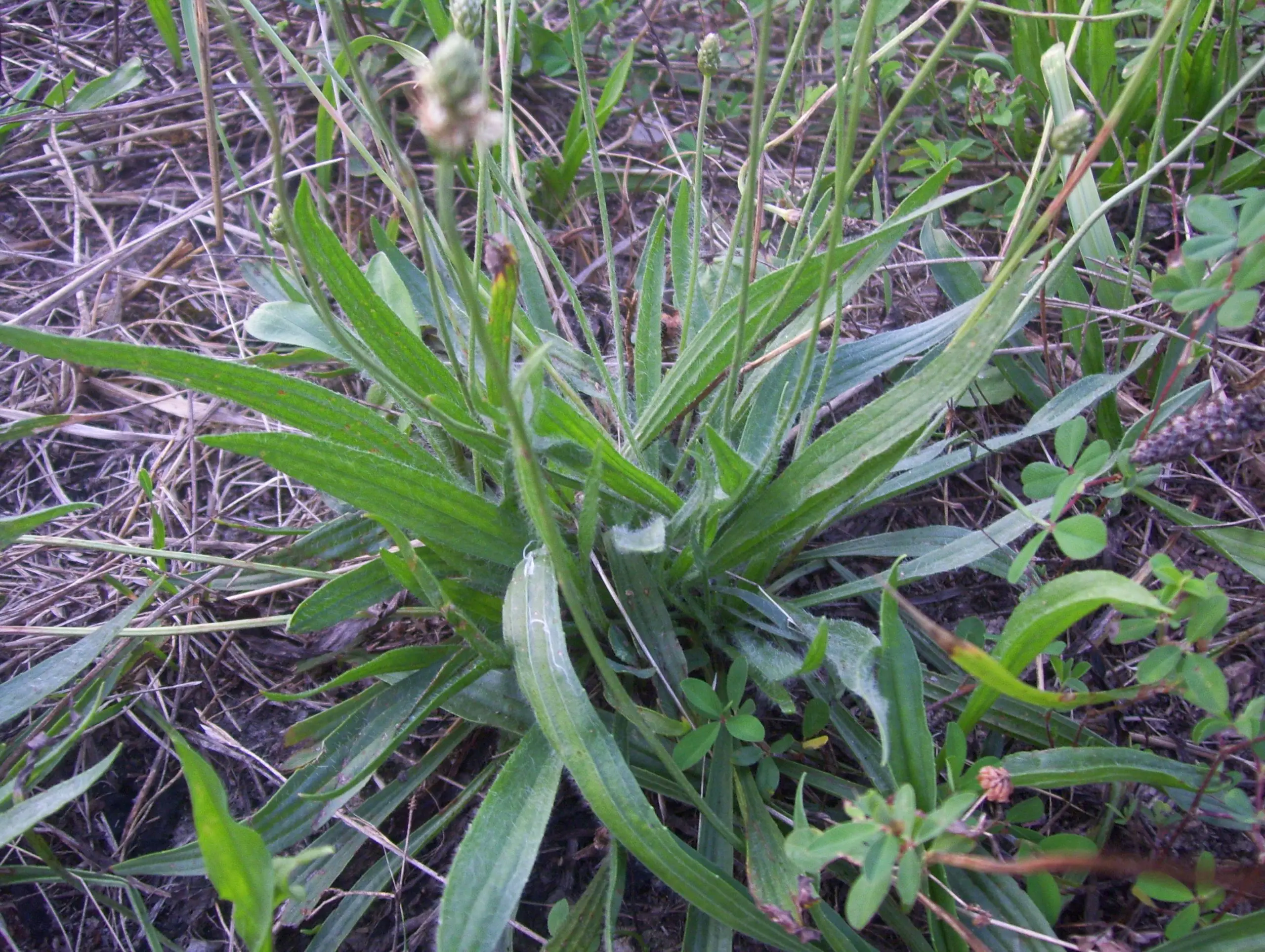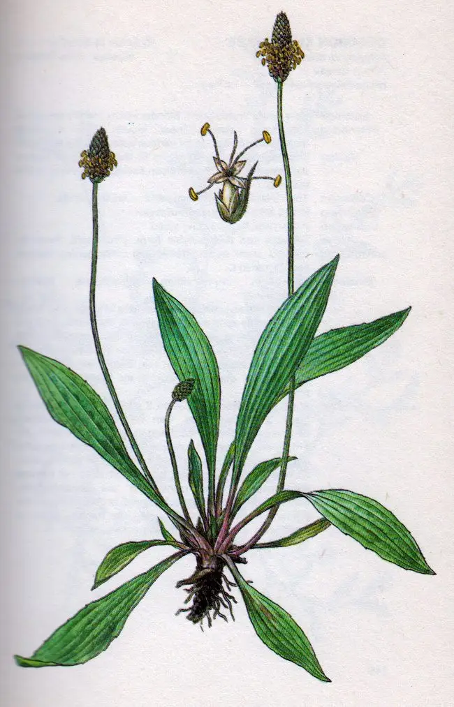 Plantago lanceolata. Common names include English plantain, narrow leaf plantain, ribwort plantain, ribleaf, lamb’s tongue, and jack straw. All of the plant is edible. It has also been used medicinally.