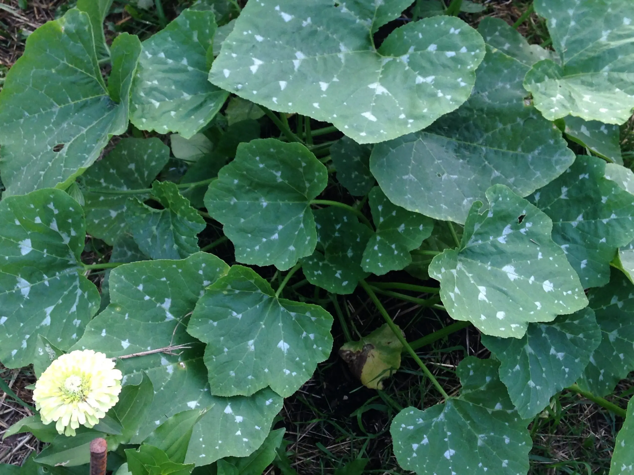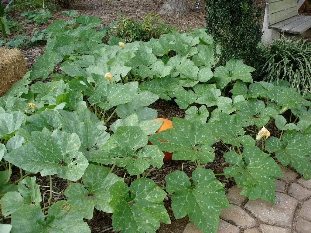 Cucurbita pepo. Not a ‘weed’, but pumpkin will grow freely and vigorously if given the chance. Volunteer pumpkins are common. They won’t always set fruit, but the leaves and the growing tips of the vine make good eating and steam well. They are sweet. Pumpkins are worth growing just for the greens.